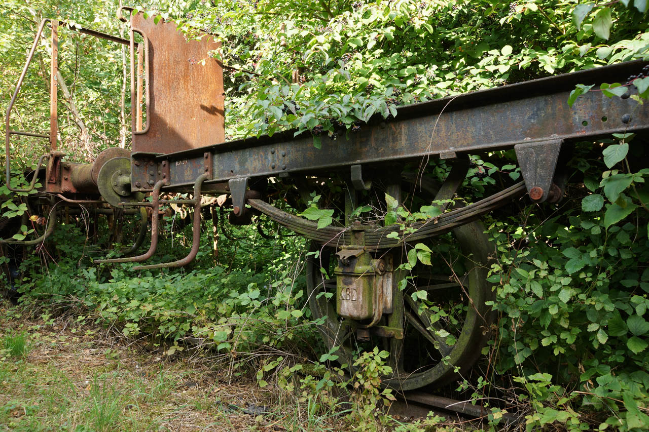 Dieses Fahrgestell gehört jedenfalls zu einem Personenwagen, immerhin ist die Bühne mit Aufstieg noch vorhanden. Doppelspeichenradsatz, Fachwerkachshalter, Gleitlager (was bedeutet KBE?), Stangenpuffer. Old style...