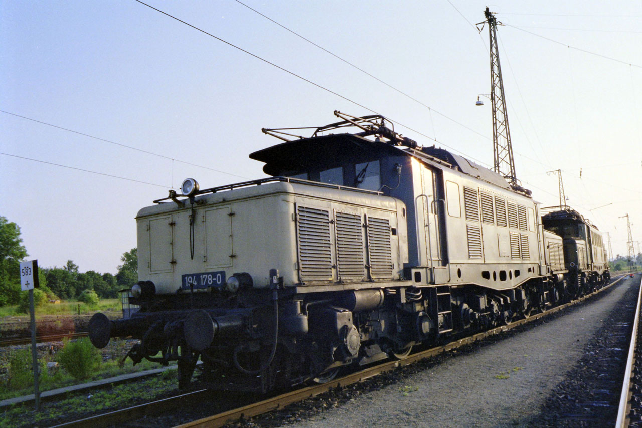 Die einzige ozeanblau-beige Lok ihrere Baureihe 194 178 zusammen mit 194 581 im BW Landshut, Sommer 1987