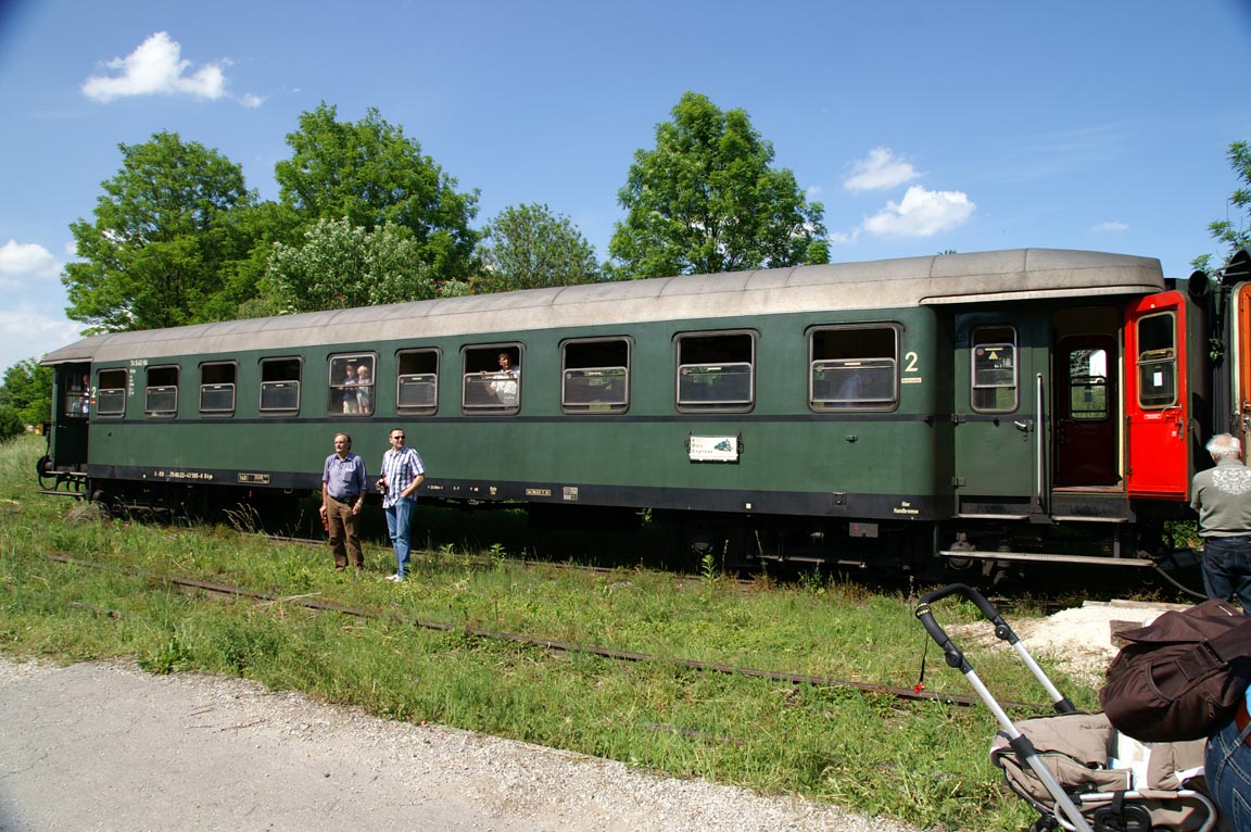 Wagen von Bayerischen Eisenbahn-Museum: Eilzugwagen DRG Bauart 1936 geschweißt, später bei der ÖBB gelaufen und umgebaut mit Faltenbalg-Übergängen, Übersetzfenstern und neuer Inneneinrichtung